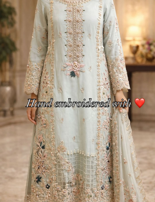 Add a touch of timeless craftsmanship to your outfit with hand-finished embroidery. Our artisans specialize in Dabka, Zardozi, Pearl Work, and Knot Work, bringing richness and elegance to every ensemble. Perfect for elevating luxury lawn and festive designer wear.