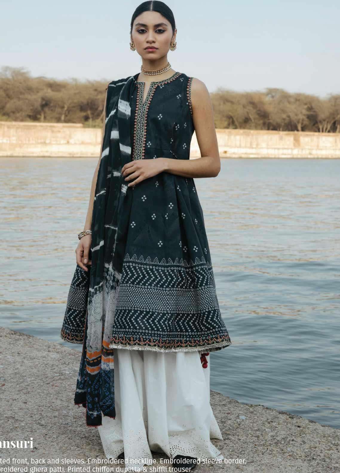 Printed front, back and sleeves Embroidered neckline Embroidered sleeve border Embroidered ghera patti Printed chiffon dupatta Shiffli bordered trouser